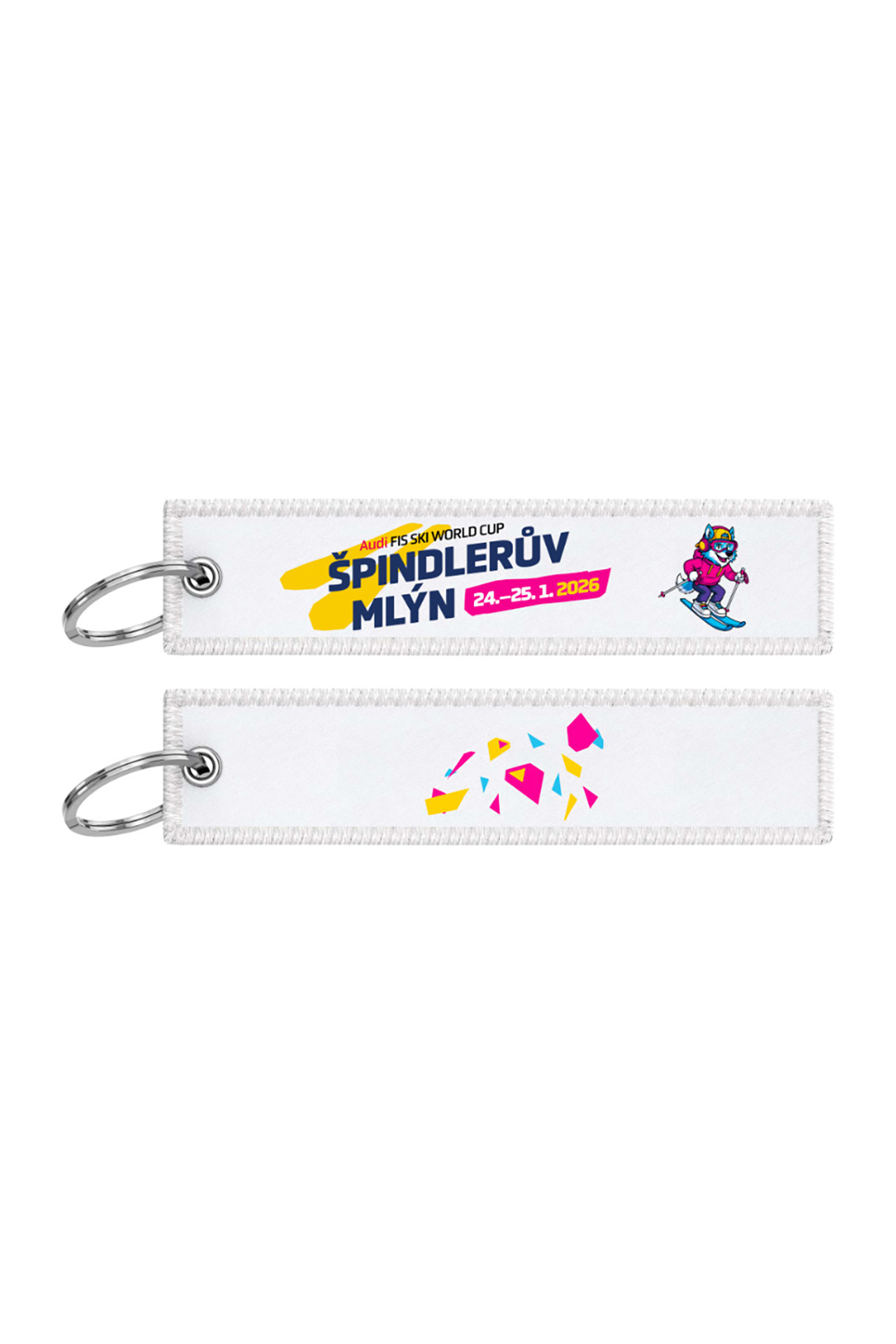 Elegantní textilní klíčenka o rozměru 12x4 cm s kovovým kroužkem.