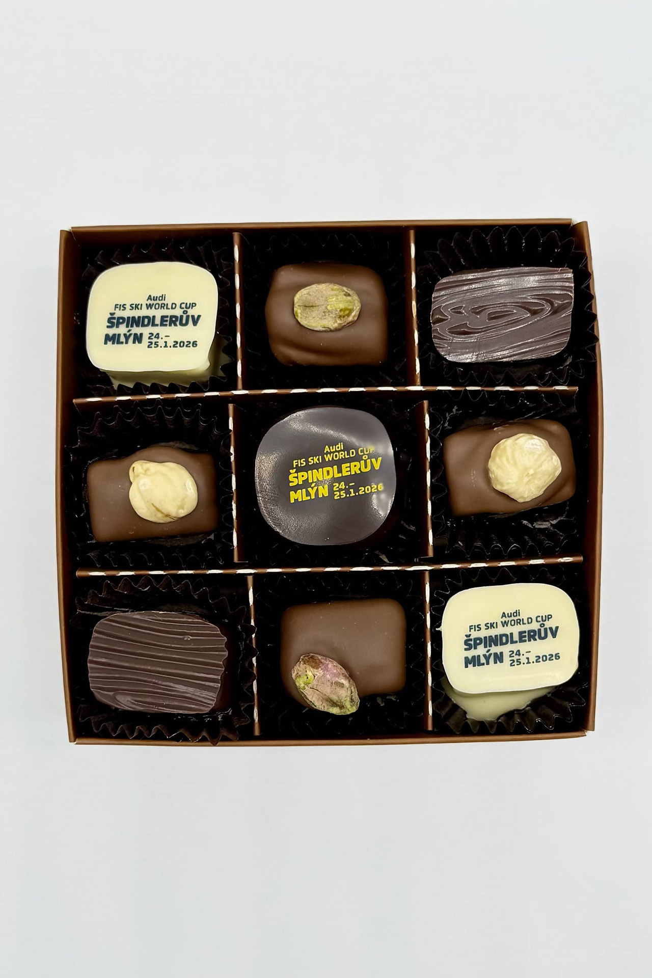 Pralinky ruční výroby z dílny Lucie Glaister z francouzské a belgické čokolády s vysokým podílem kakaové hmoty a kakaového másla.